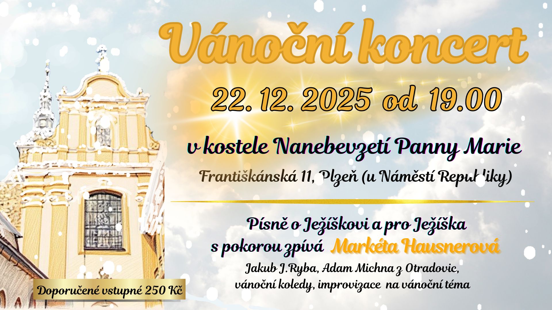 Srdečně vás zvu na vánoční koncert 22. 12. od 19.00 v kostele Nanebevzetí Panny Marie ve Františkánské ulici č. 11 (kousek od náměstí), Plzeň. Koncert bude trvat 60 minut.